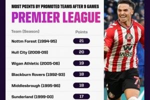 桑德兰联赛前9轮豪取17分!在英超历史升班马同期战绩并列第6位
