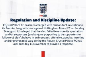 公告内容:“水晶宫足球俱乐部因8月24日对阵诺丁汉森林足球俱乐部的英超联赛中存在不当行为而受到指控,该俱乐部未能确保其观众及/或支持者(以及任何自称支持者或追随者的人员)在比赛期间避免采取不当、冒犯性、辱骂性、侮辱性及/或挑衅性行为。”